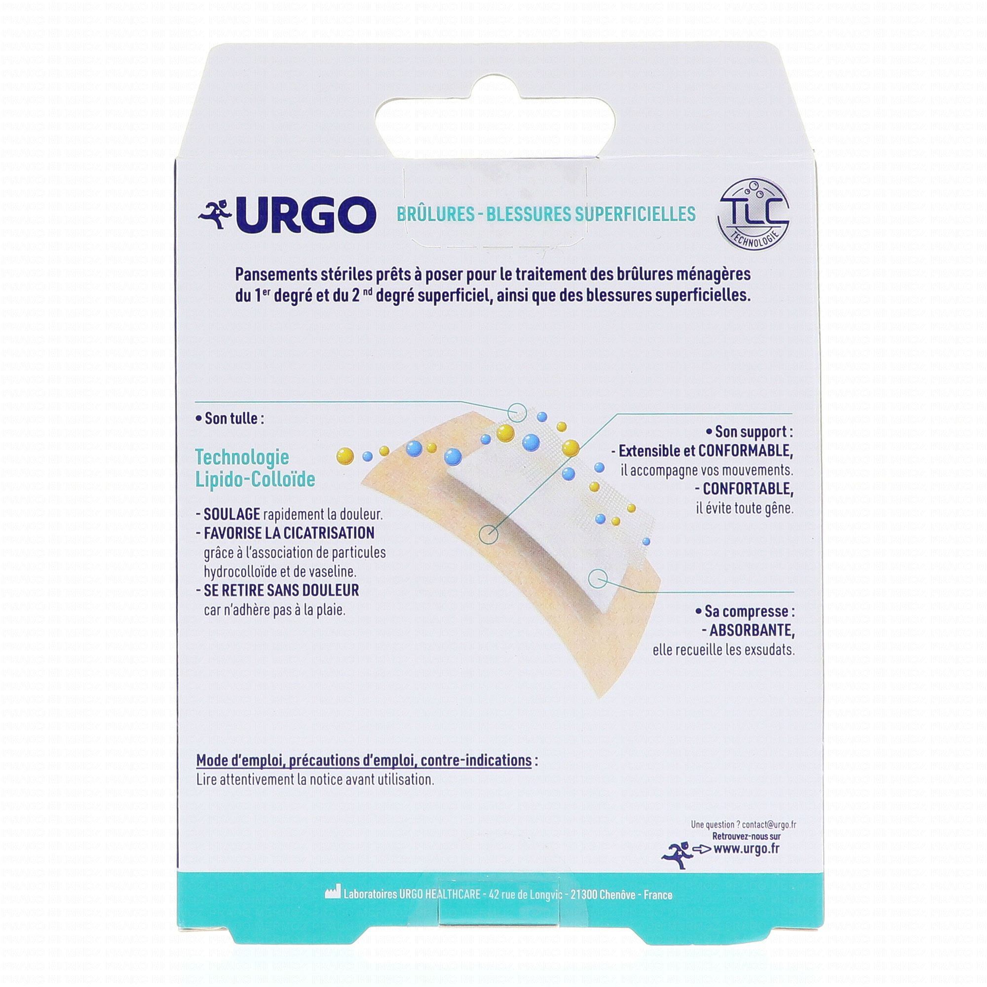 Les pansements Urgo sont destinés aux brulures du premier et du second degré ainsi qu' aux blessures superficielles comme les coupures. Ils soulagent, apaisent et favorisent la cicatrisation grâce au tulle fabriquée à partir de la technologie lipidocolloïde (TLC) qui combine la vaseline et l'hydrocolloïde. Souple, leur support extensible permettent de s'adaptent aux mouvements et garantissent un retrait indolore sans douleur.