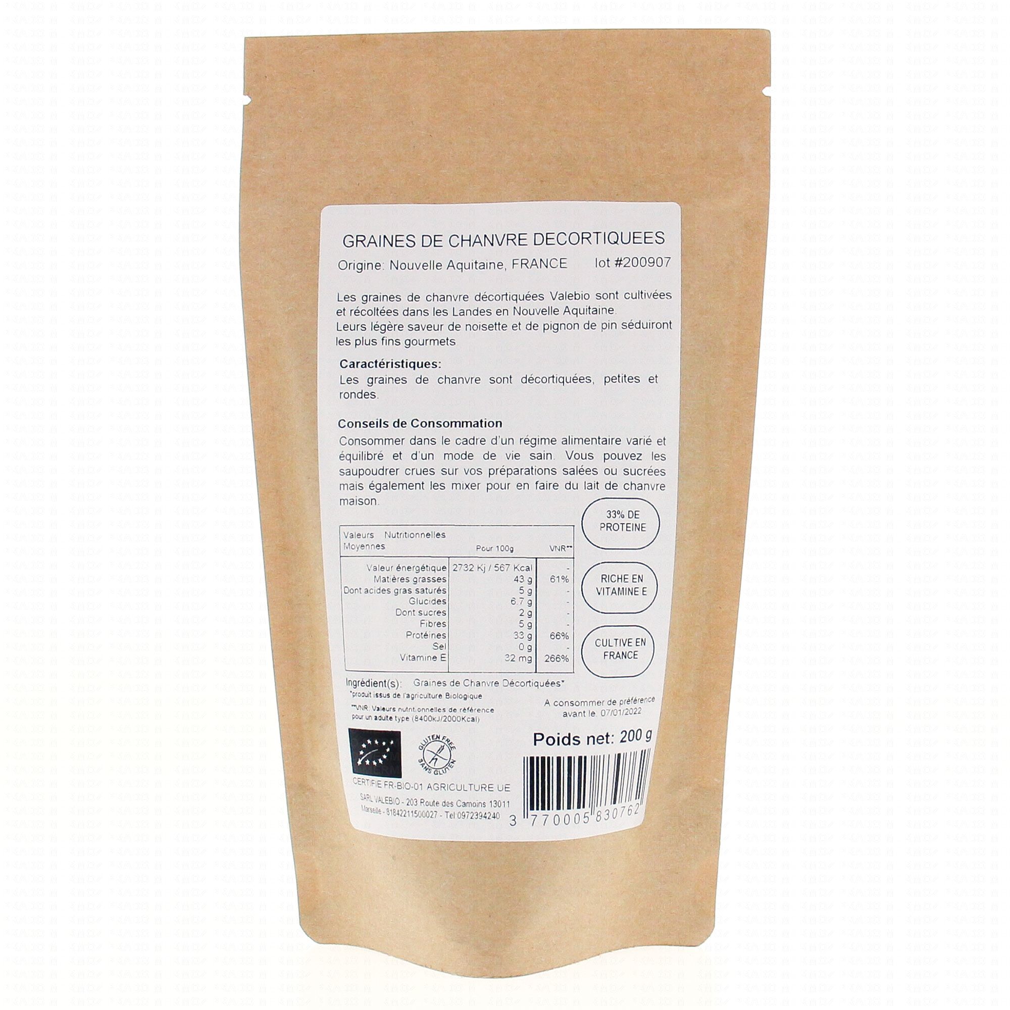 VALEBIO Graine de Chanvre BIO sachet 200g contient les éléments suivants :