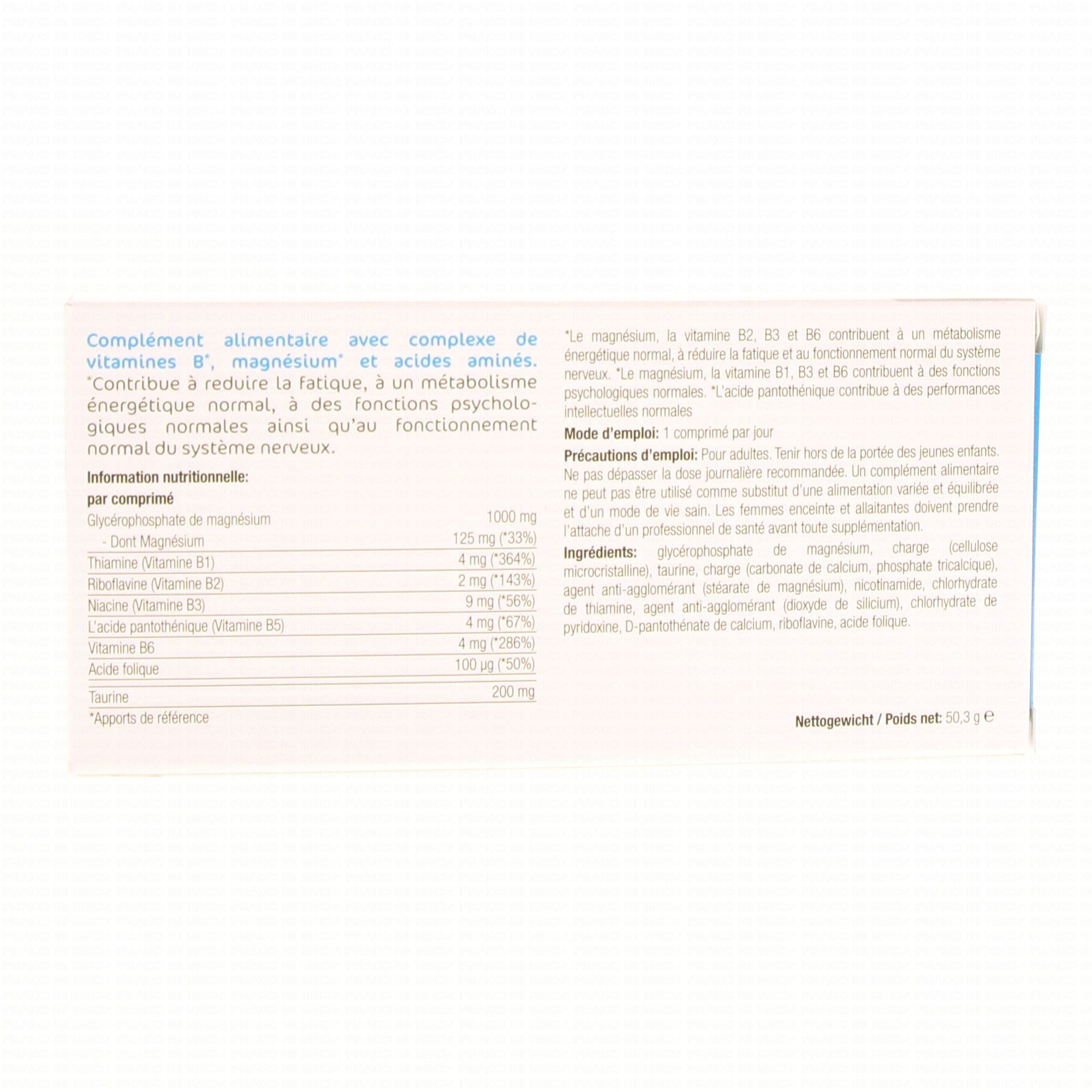 Glycérophosphate de magnésium, agent de charge : cellulose microcristalline, taurine, agent de charge : phosphate tricalcique, anti-agglomérant : stéarate de magnésium, agent d' enrobage : hydroxypropylmethylcellulose, anti-agglomérant : silice colloïdale, nicotinamide (Vitamine B3), chlorhydrate de thiamine (Vitamine B1), chlorhydrate de pyridoxine (Vitamine B6), panthothénate de calcium (Vitamine B5), agent d' enrobage : talc, riboflavine (Vitamine B2), agents d' enrobage : hydroxypropylcellulose, huile de noix de coco, acide folique (Vitamine B9).