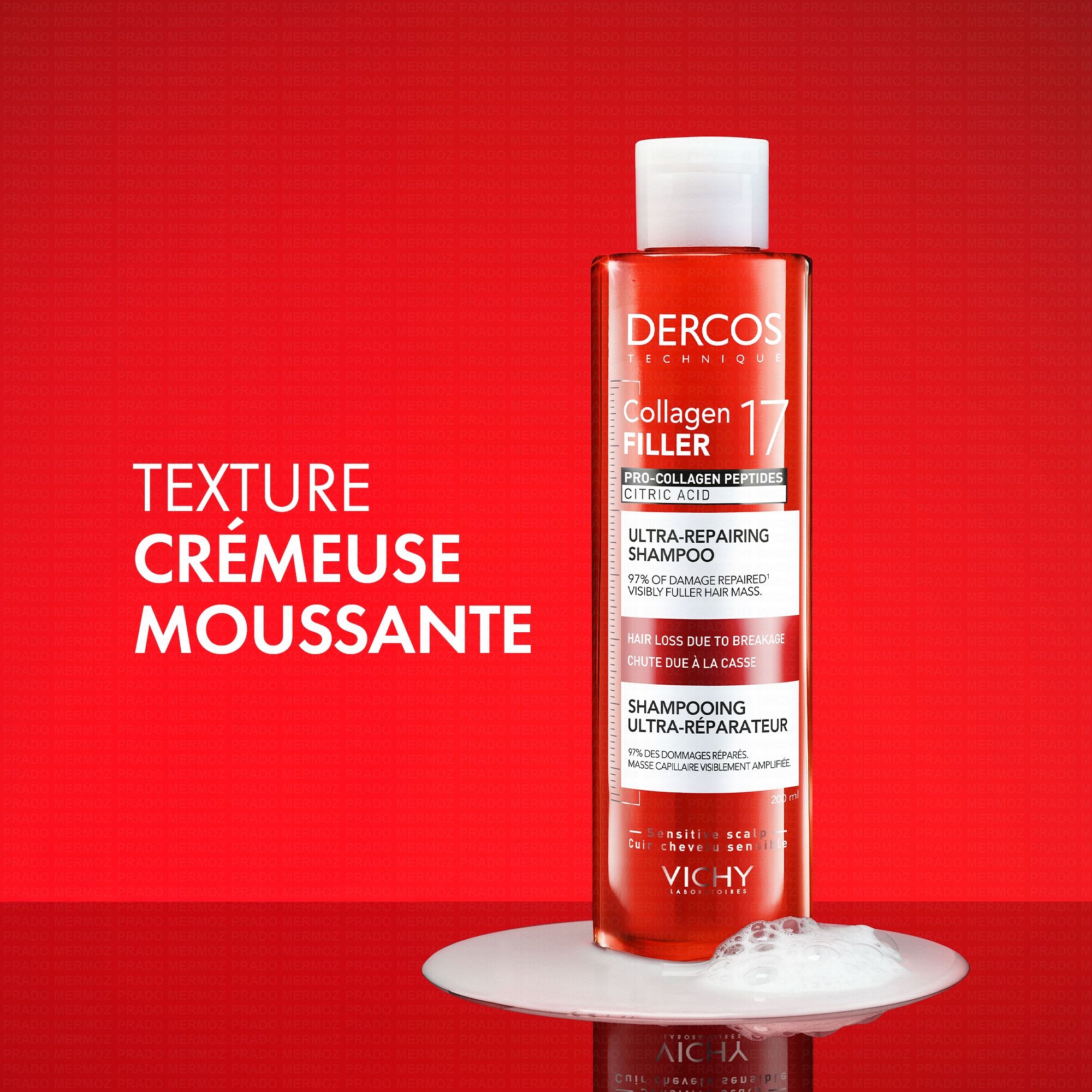 Découvrez le Shampooing Ultra-Réparateur Collagen 17 Filler. Son efficacité cliniquement prouvée offre une fibre capillaire 10x plus forte (1), +53% de volume (2) et une masse capillaire visiblement amplifiée (3). Le tout dans une texture crémeuse moussante. Nouveau protocole Dercos complet anti-casse (pré-shampooing, shampooing, après-shampooing). Ce protocole, enrichi en Peptides Pro-Collagènes et en Acide Citrique, agit sur la résilience des cheveux fragilisés par la perte de Collagène 17. Il renforce en profondeur la structure interne de la fibre et prévient la chute due à la casse. 5 ans de dommages réparés en 1 utilisation (4) et des cheveux 10x plus fort (1) avec une masse visiblement amplifiée (3).