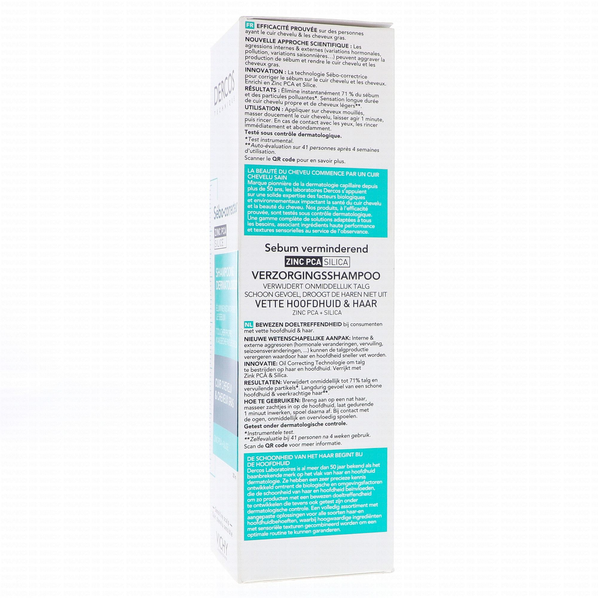 Le shampooing sébo-correcteur Dercos est enrichi en zinc PCA et en silice, reconnus pour leurs propriétés sébo-correctrices. Le zinc PCA permet notamment de réguler la production de sébum tandis que la silice est capable d'absorber 5 fois son poids en sébum. Finalement, l'eau volcanique de Vichy aide à renforcer et protège la barrière cutanée.