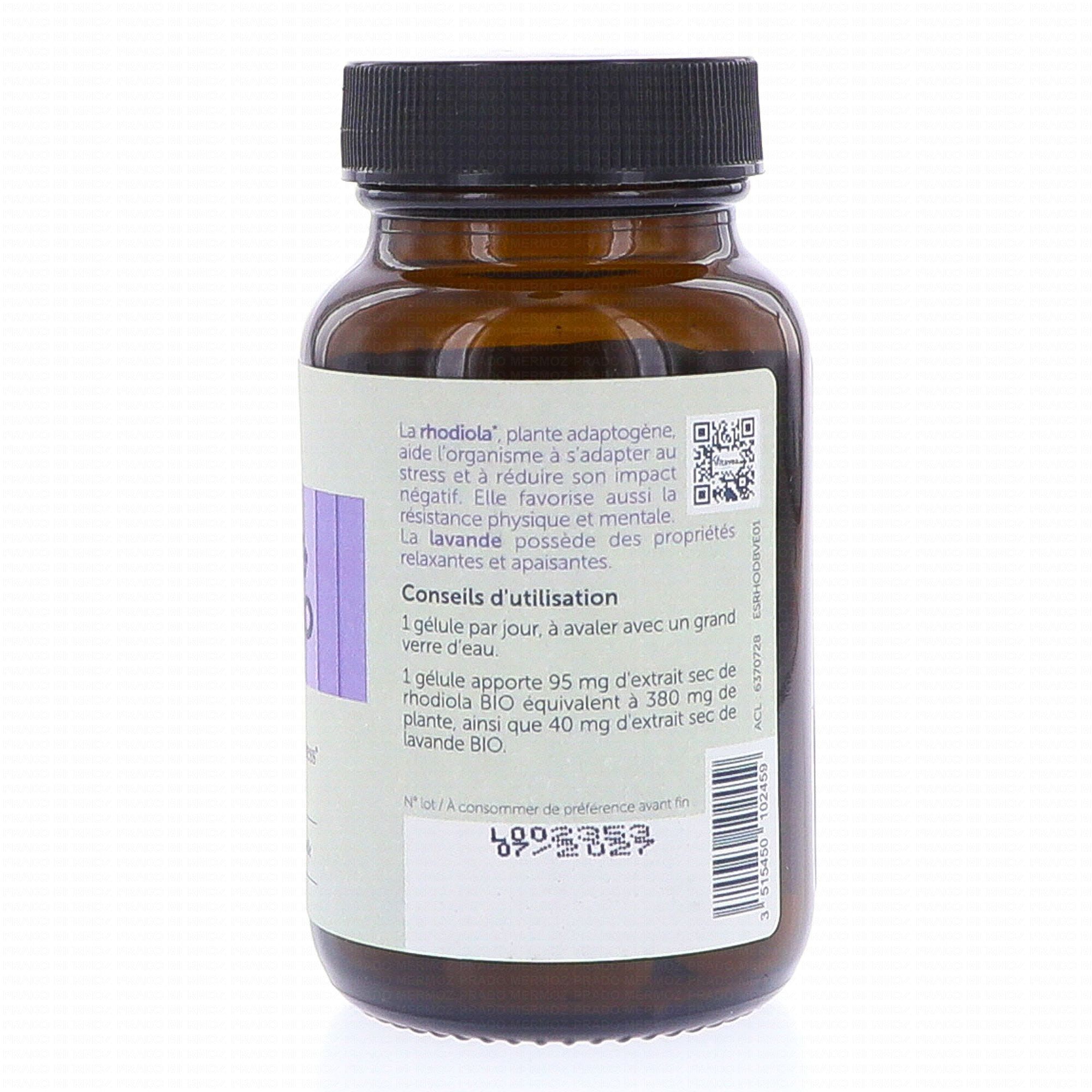 Extrait de rhodiola* (Rhodiola rosea) ; gélule d'origine végétale (dérivé de cellulose) ; extrait de lavande* (Lavandula angustifolia) ; gomme d'acacia* (Acacia seyal) ; amidon de riz* ; anti-agglomérant : carbonate de magnésium.