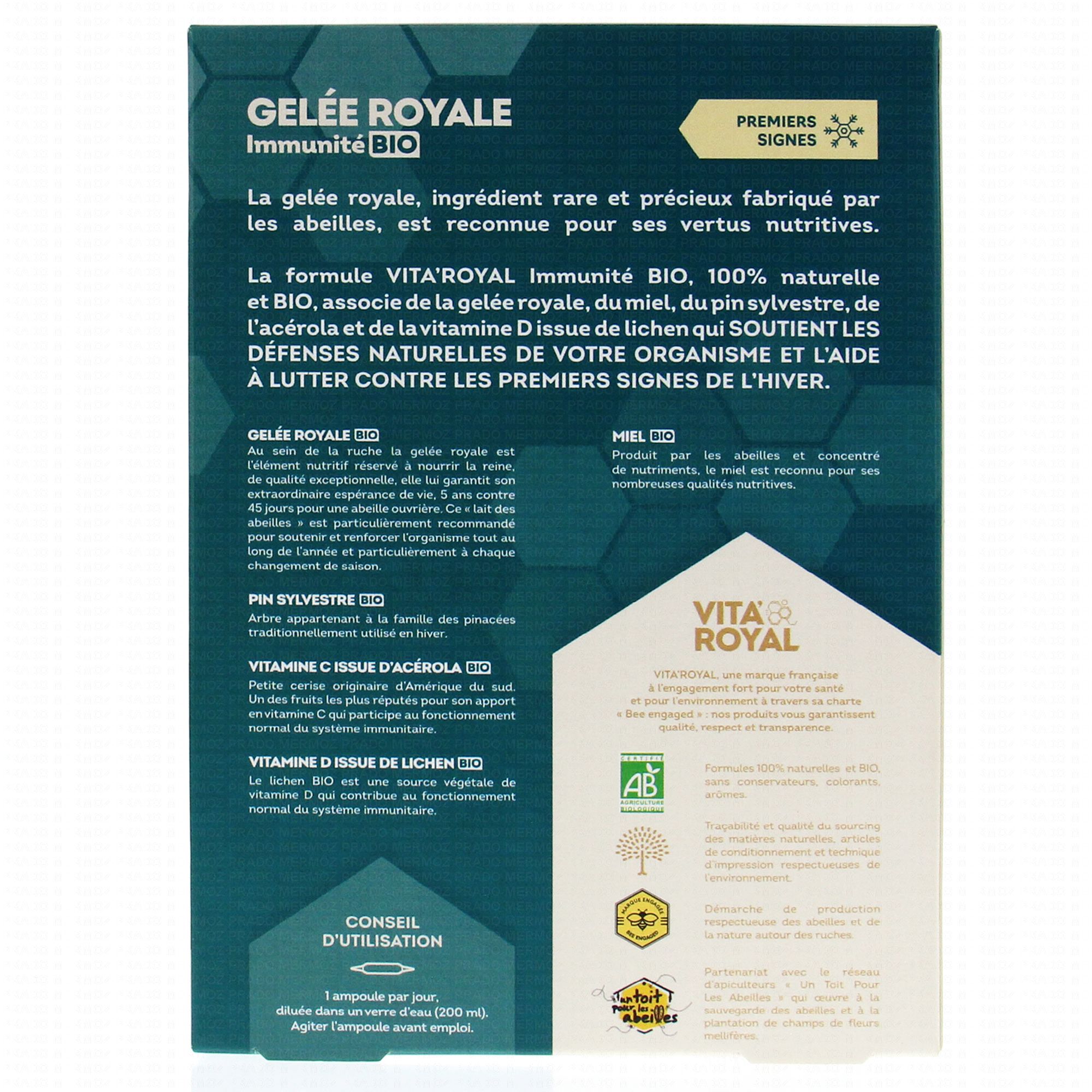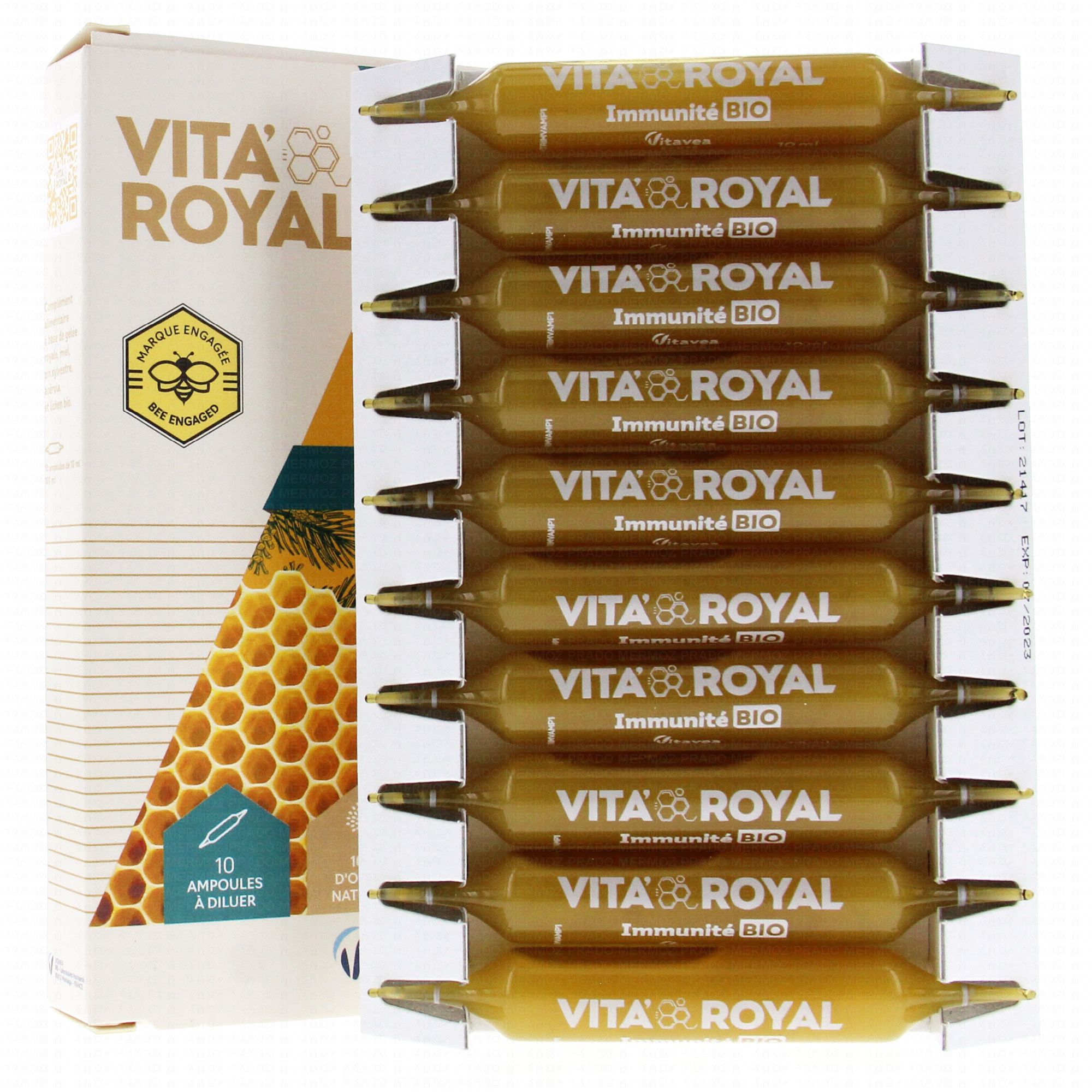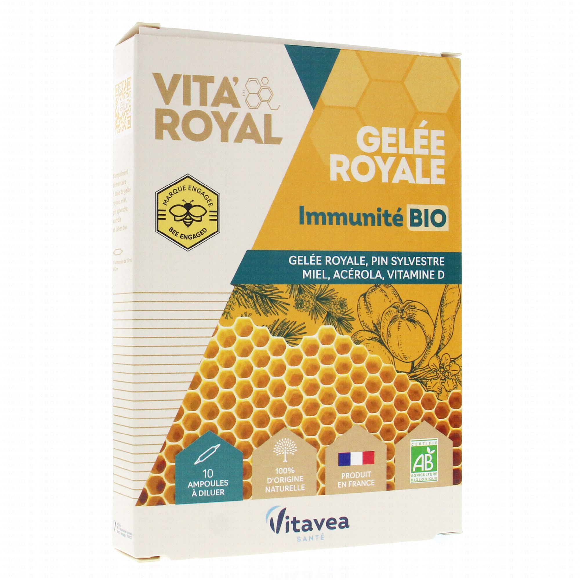 VITAVEA Vita'Royal Gelée Royale Immunité BIO 10 ampoules est un complément alimentaire qui contribue à améliorer la vitalité grâce à la présence de Gelée Royale. Les vitamine C et D aident à renforcer le système immunitaire. Le Pin sylvestre aide à soutenir le confort respiratoire.
