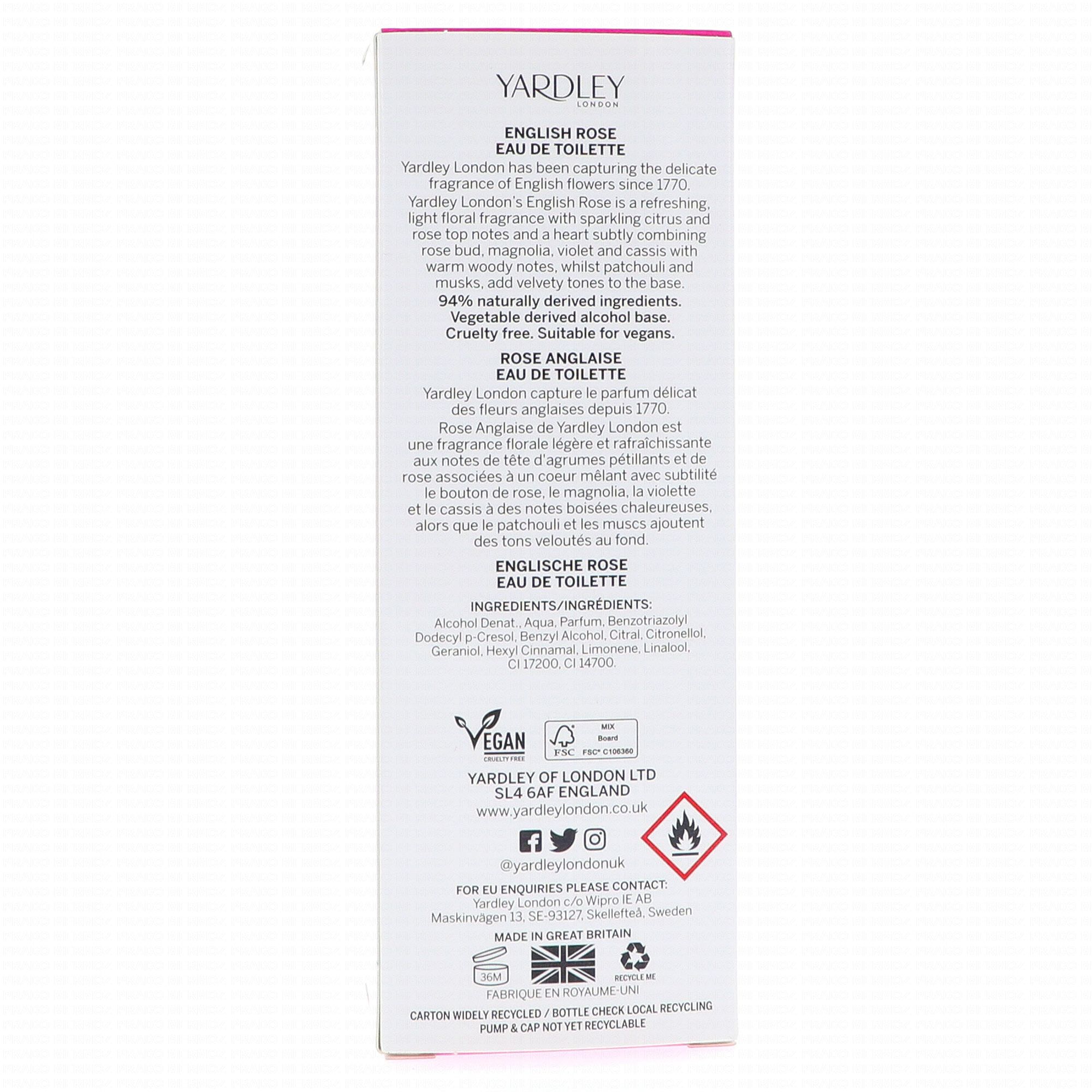 Si vous ressentez l'un de ces symptômes après avoir utilisé l'Eau de Toilette Yardley English Rose, cessez immédiatement l'application et rincez abondamment à l'eau claire. Si les symptômes persistent, consultez un médecin.